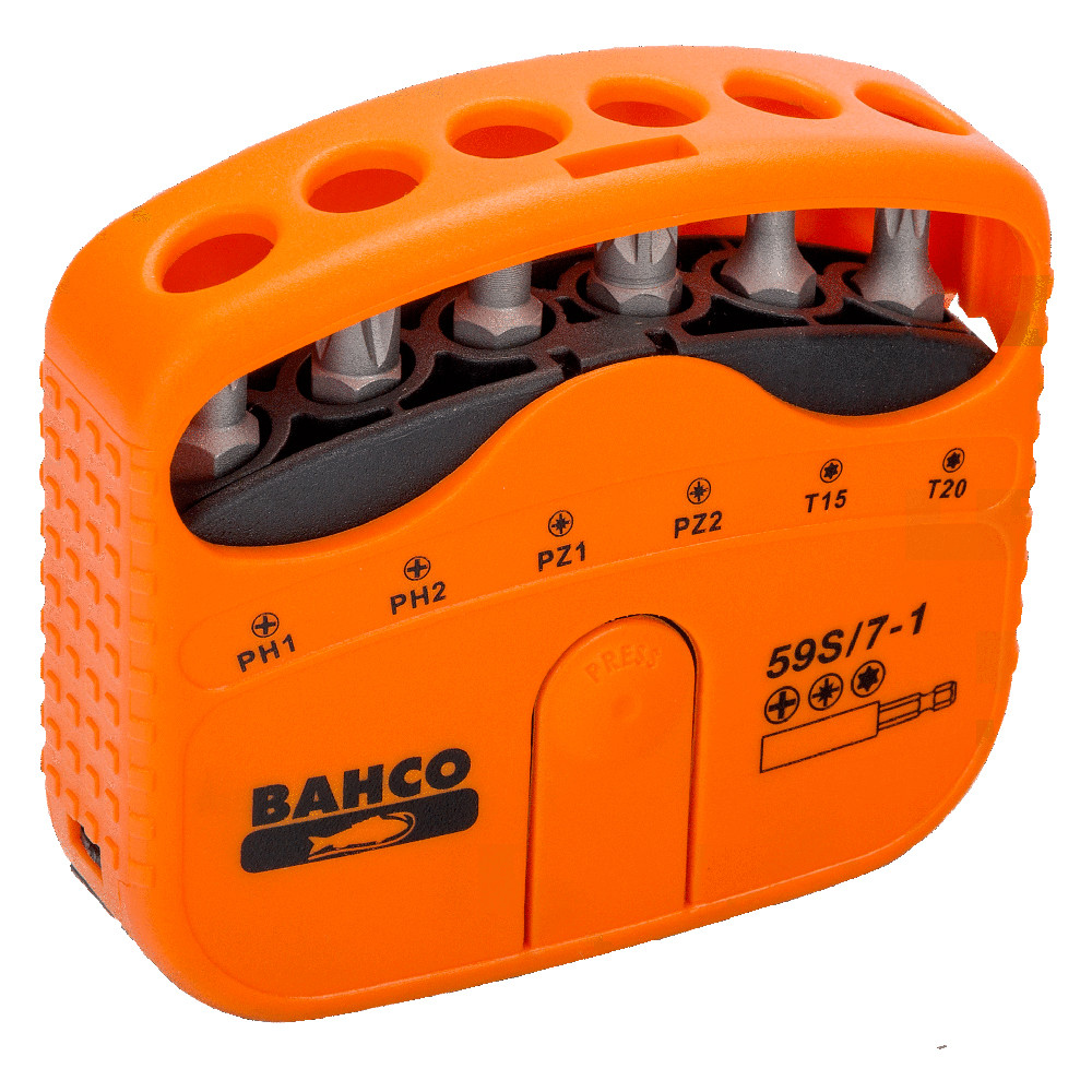Набір біт під гвинти Phillips, Pozidriv та Torx® BAHCO 59S/7-1. У наборі 6 біт та 1 магнітний тримач. Виготовлено набір BAHCO 59S/7-1 із високоякісної легованої сталі.